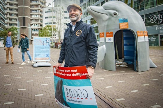 Dirk-Jan Verdonk overhandigt in 2021 80.000 handtekeningen voor een fokverbod voor dolfijnen in gevangenschap aan Tweede Kamerleden Kamerleden Frank Wassenberg en Laura Bromet.
